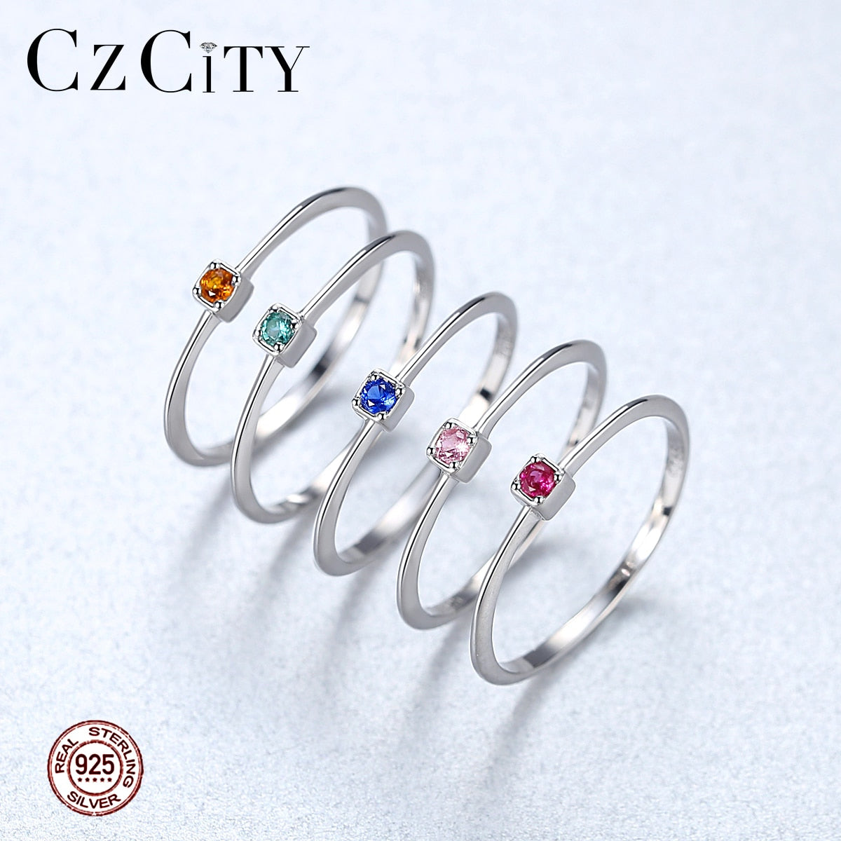 CZCITY Genuine 925 Sterling Silver VVS Green Topaz Wedding Rings for Women Minimalist Thin Circle Gem Rings Jewelry Carving S925